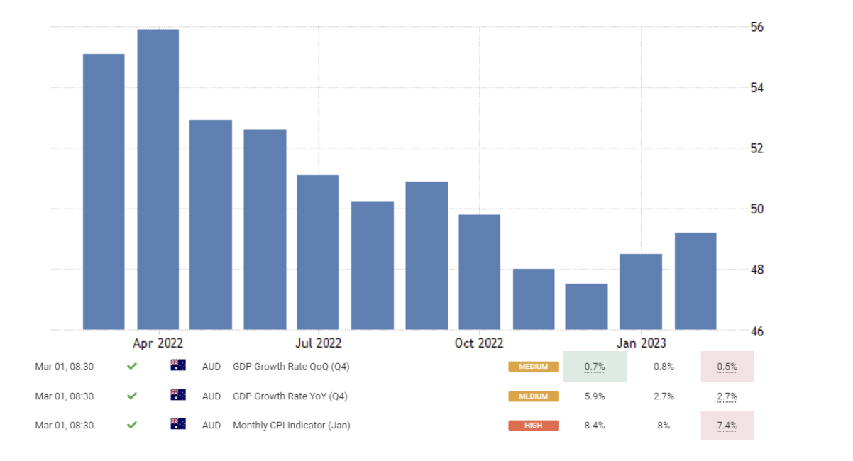 Mar 01 07:00 JPT; 22:00 GMT, 2023 年 2 月の柔道銀行オーストラリア総合 PMIは、速報値で前月の 48.5 から 49.2 まで上昇しました。