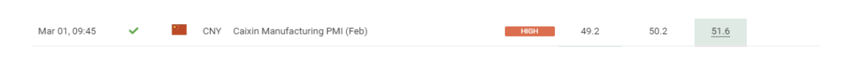 Mar 01 10:45 JPT; 01:45 GMT, 2023 年 2 月の Caixin 中国総合製造業 PMI は 1 月の49.2 から51.6 に上昇し、市場コンセンサスの 50.2 を上回りました。