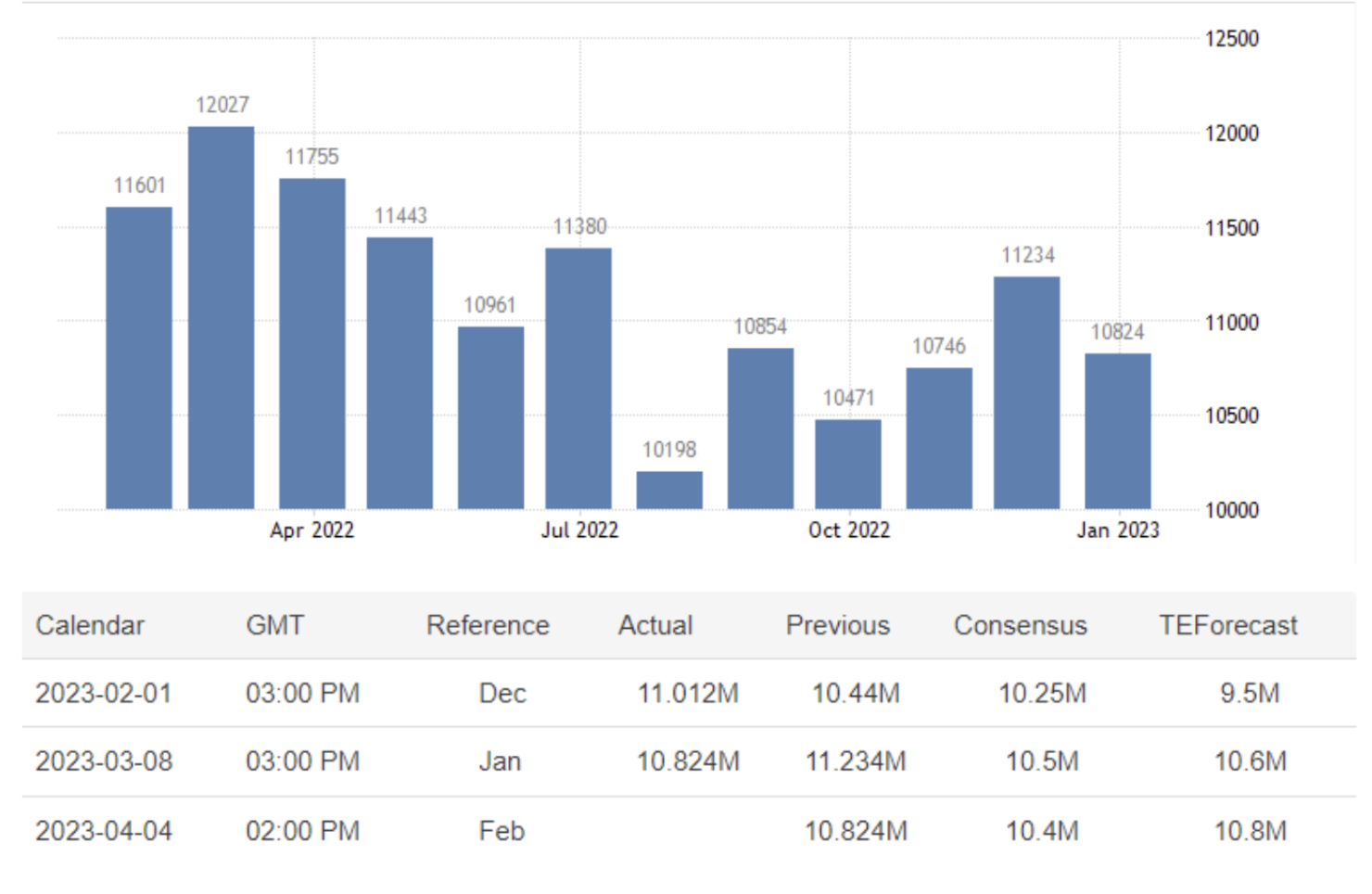 April 04 23:00 JPT; 14:00 GMT, 2023 年1 月の米国の求人数は、市場予想の1050 万人減に対し、上方修正された12 月の1123 万4 千人から41 万人減の1082 万4 千人となりました。雇用者数は640 万人、離職者総数は590 万人とほとんど変化がなかった。離職のうち、辞職は2021 年5 月以来の低水準となる388 万4000 人に減少し、解雇・退社は170 万人に増加しました。