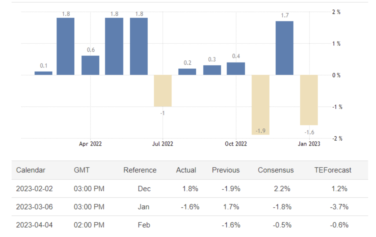 April 04 23:00 JPT; 14:00 GMT, 2023 年1 月の米国製造業の新規受注は、前月比1.6%の減少しました。12 月は1.7%の減少と下方修正されましたが、市場予測の1.8%の減少を上回りました。輸送用機器の受注は13.3%減少し、非防衛用航空機および部品の54.5%減少がその足を引っ張った結果、前年同月比では4.3%の増加となりました。