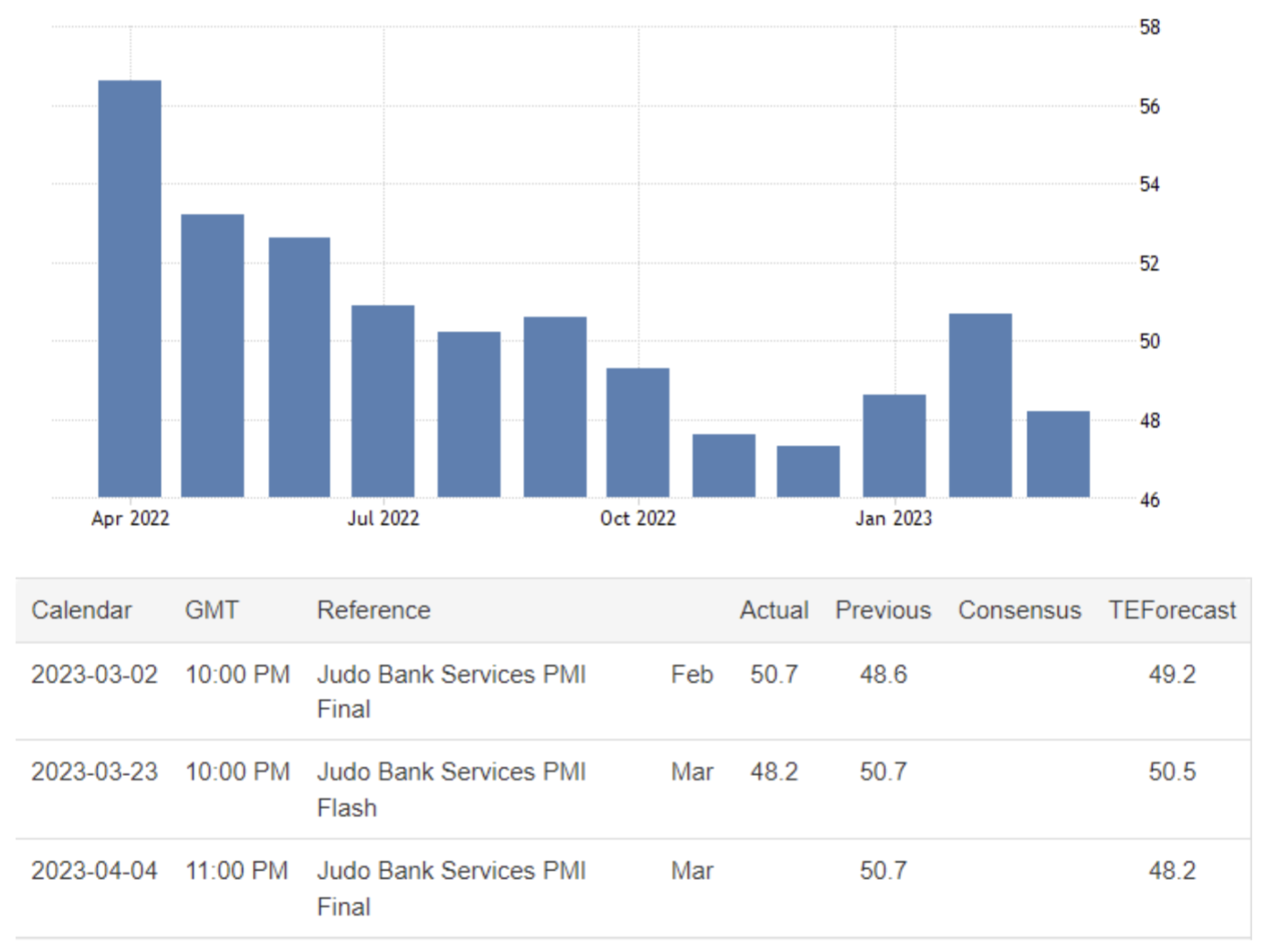 April 03 08:00 JPT; 23:00 GMT, 2023 年3 月の柔道銀行オーストラリアサービス業PMI は48.2 となり、2 月の50.7 から低下したことが速報値で示されました。加えて2 月に拡大した後、過去6 ヶ月間で5 ヶ月目の縮小を記録しています。企業マインドは先行きへの期待から2 ヶ月ぶりの高水準となり、引き続き良好であったでしょう。