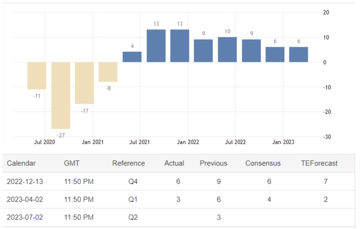 April 03 08:50 JPT; 23:50 GMT, 日本の見通しは、2022 年第4 四半期の6 ポイントから2023 年第1 四半期は6 ポイントに据え置かれました。