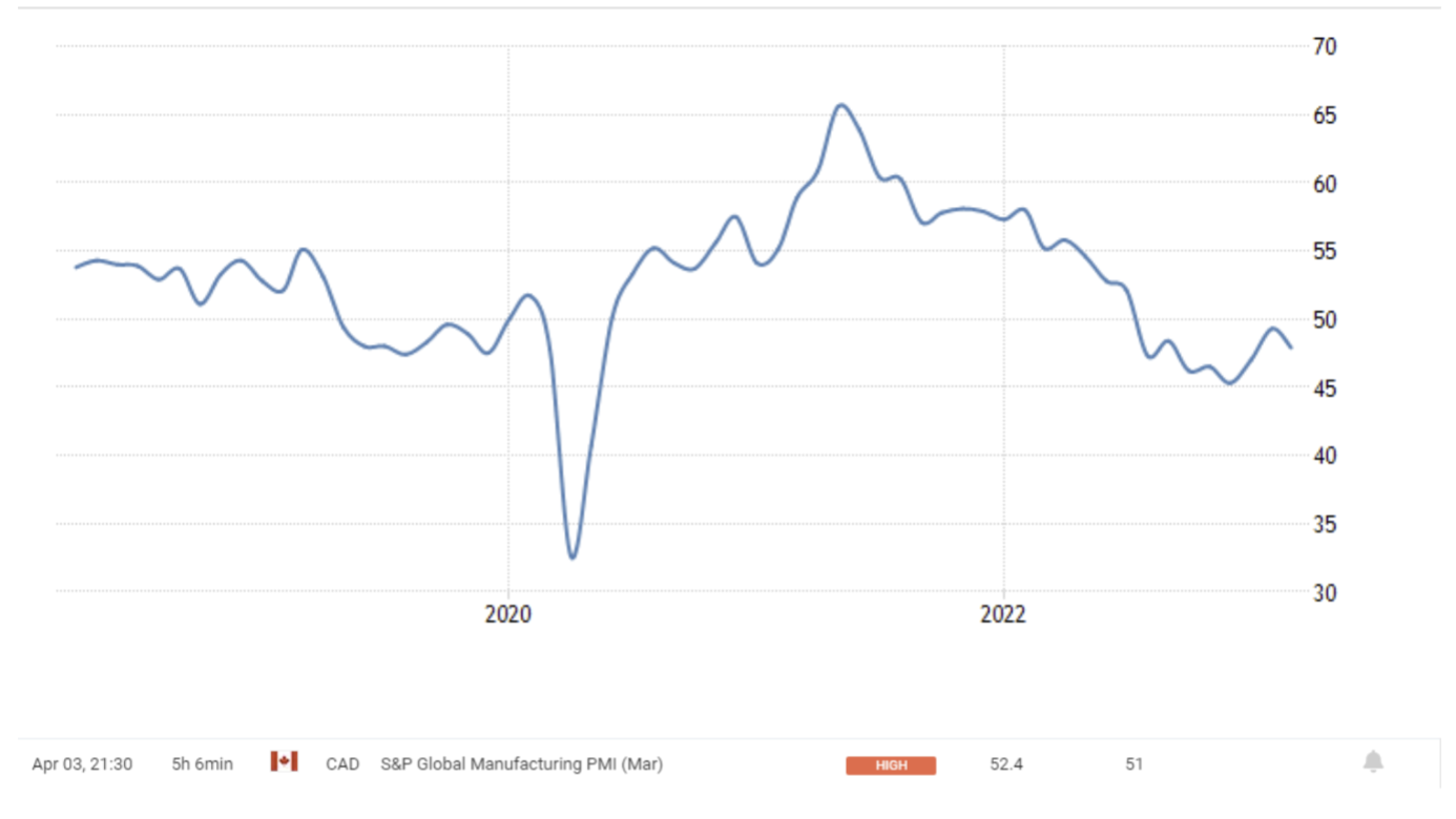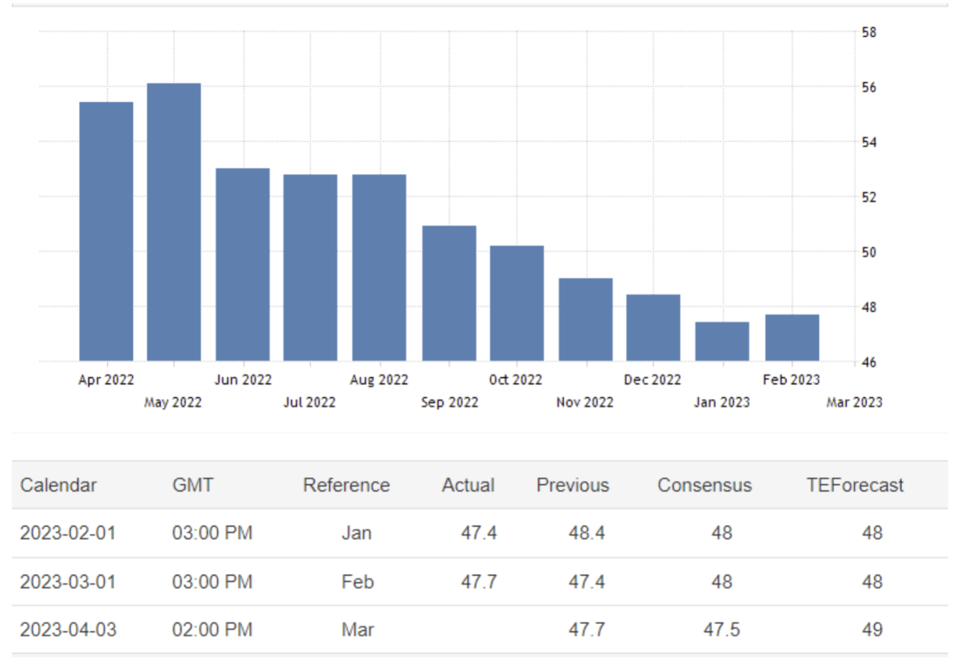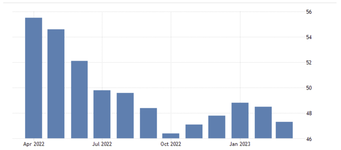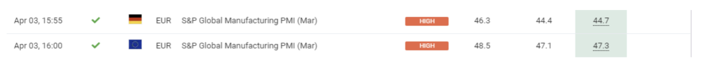 April 03 17:00 JPT; 08:00 GMT, 2023 年3 月のS&P グローバル・ユーロ圏製造業PMI は47.3となり、事前予想の47.1 からほとんど変化せず、前月の48.5 から低下しました。背景には工場受注が11 ヵ月連続で減少し、サプライヤーの納期が調査史上最短となったことから、今回の数値は昨年11 月以来、圏内の製造業の健全性が最も急激に悪化したことを指摘するものです。