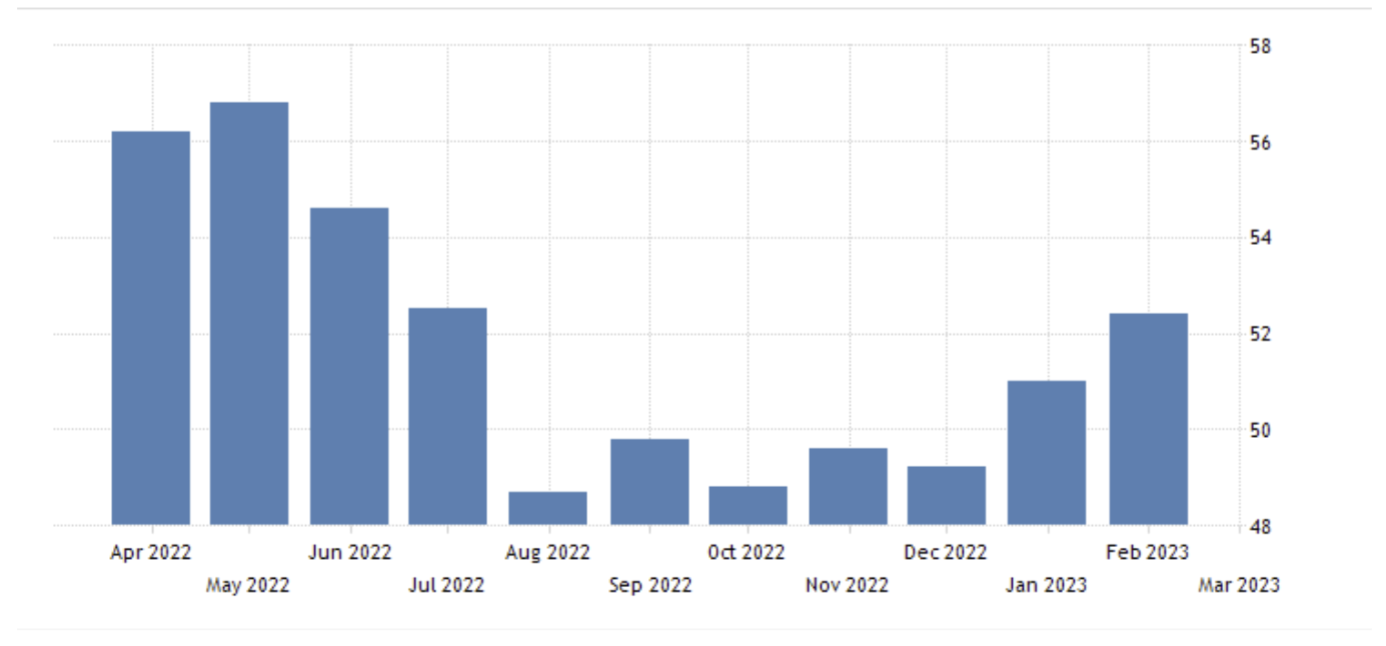 April 03 22:30 JPT; 13:30 GMT, S&P グローバル・カナダ製造業PMI は、2023 年2 月に前月の51 からさらに上昇し52.4 となりました。この最新値は、工場活動の2 ヶ月連続の拡大と昨年7 月以来の早さを指摘するものです。物価面では、サプライチェーンがより安定しているとの報告を受け、インフレ率の緩和が続きました。