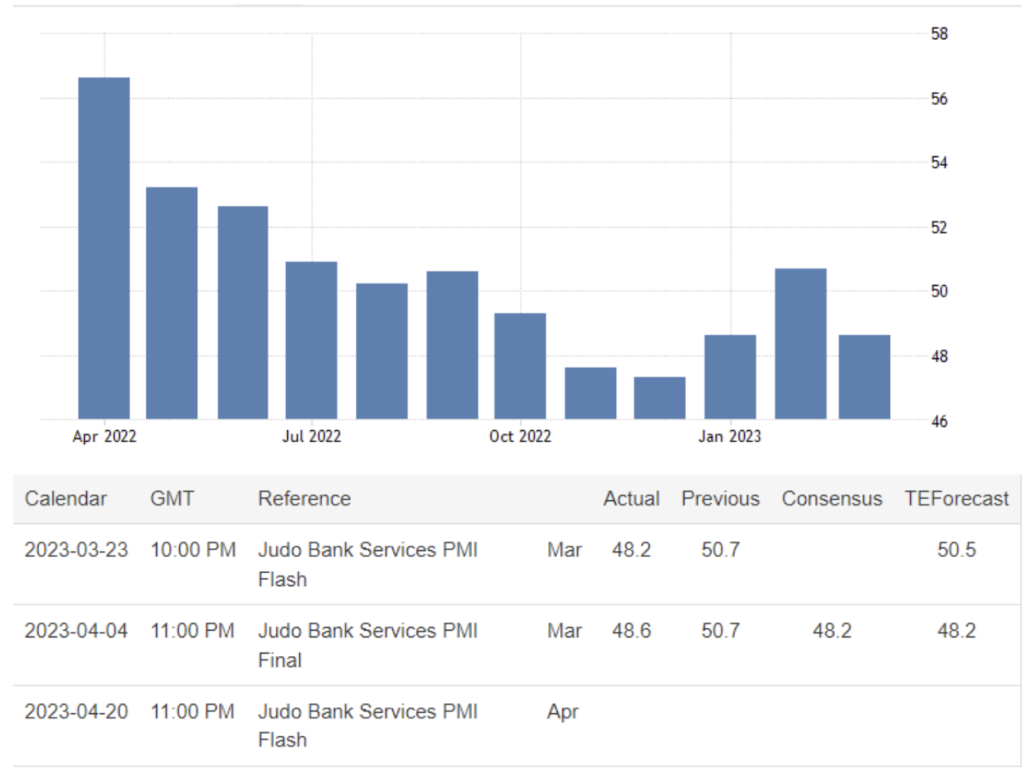 April 05 08:00 JPT; 23:00 GMT, 2023 年3 月の柔道銀行オーストラリアサービス業PMI は48.6 となり、2 月の50.7 から低下したことが最終予測で明らかになりました。