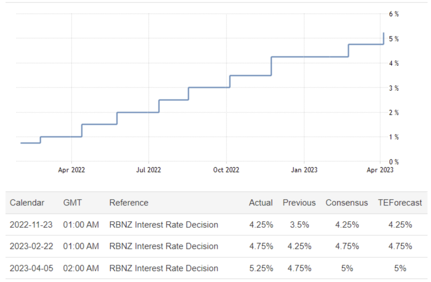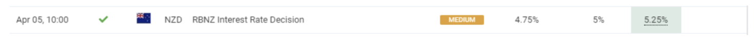 April 05 11:00 JPT; 02:00 GMT, ニュージーランド準備銀行(Reserve Bank of New Zealand)は4 月の会合で、公定歩合を50bps 引き上げ、2008 年12 月以来の高水準となる5.25%にした。水曜日の動きは11 回連続の上昇で、消費者インフレが依然として高く、雇用が最大持続可能水準を超える中、理事会は引き締めペースを維持し、25bps の引き上げという市場予想に反したものでした。