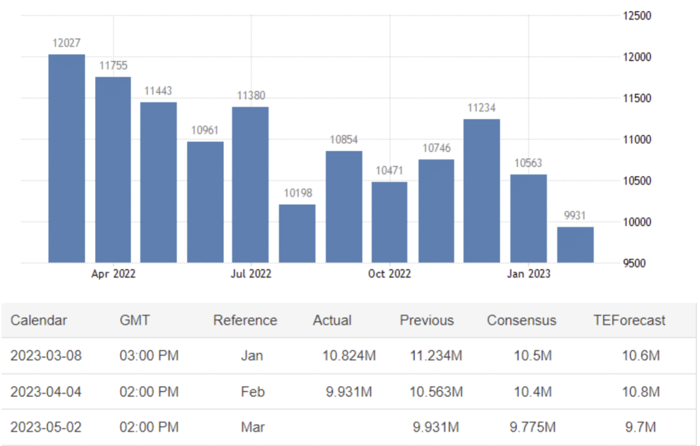 May 03 08:00 JPT; 23:00 GMT, 2023年2月の米国の求人数は63万2000人減の990万人で、2021年5月以来の低水準となり、市場予想の1040万人を下回り、労働市場が冷却し始めた可能性を示唆しました。