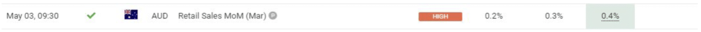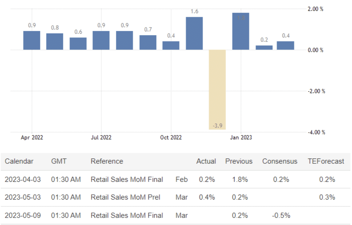 May 03 10:30 JPT; 01:30 GMT, 2023年3月のオーストラリアの小売売上高は、前月比0.4%増の353億豪ドルとなり、前月の0.2%増を上回ったことが速報で発表されました。これは、食品小売業が持ち直し、13ヵ月連続の増加(2月の0.3%増に対して1.0%)となっており、前年同月比では、小売売上高は5.4%増と、2021年9月以来の低い伸びとなった。