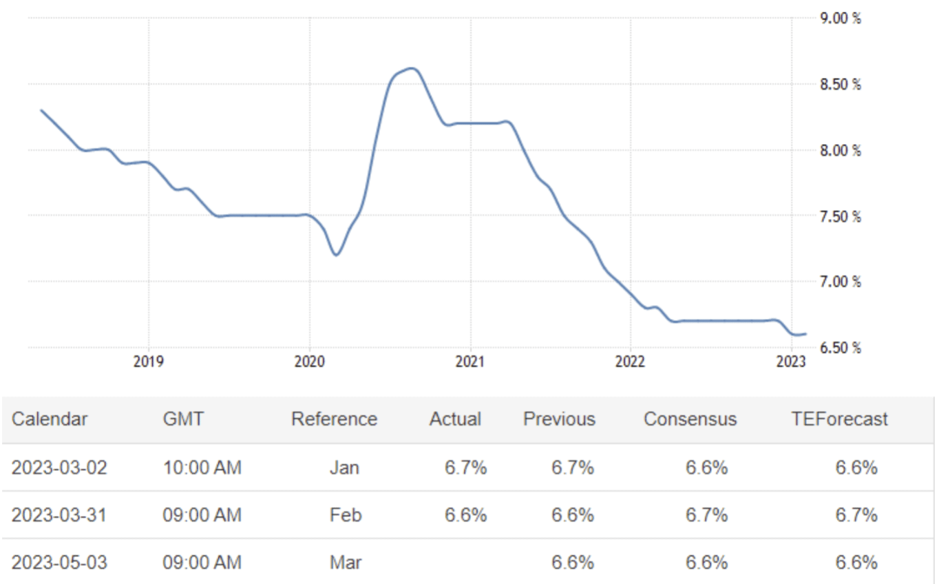 May 03 18:00 JPT; 09:00 GMT, 2023年2月のユーロ圏季節調整済み失業率は、1月と変わらず、市場予想の6.7%をわずかに下回り、過去最低の6.6%となった。失業者数は、前月比59千人減の1,114万2千人となりました。ユーロ圏の経済大国のうち、失業率が最も低かったのはドイツ(2.9%)、最も高かったのはスペイン(12.8%)、イタリア(8%)、フランス(7%)でした。