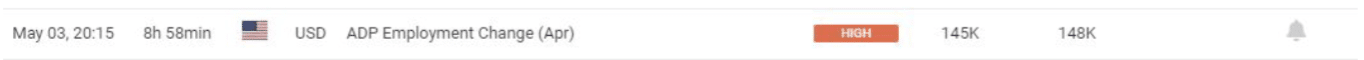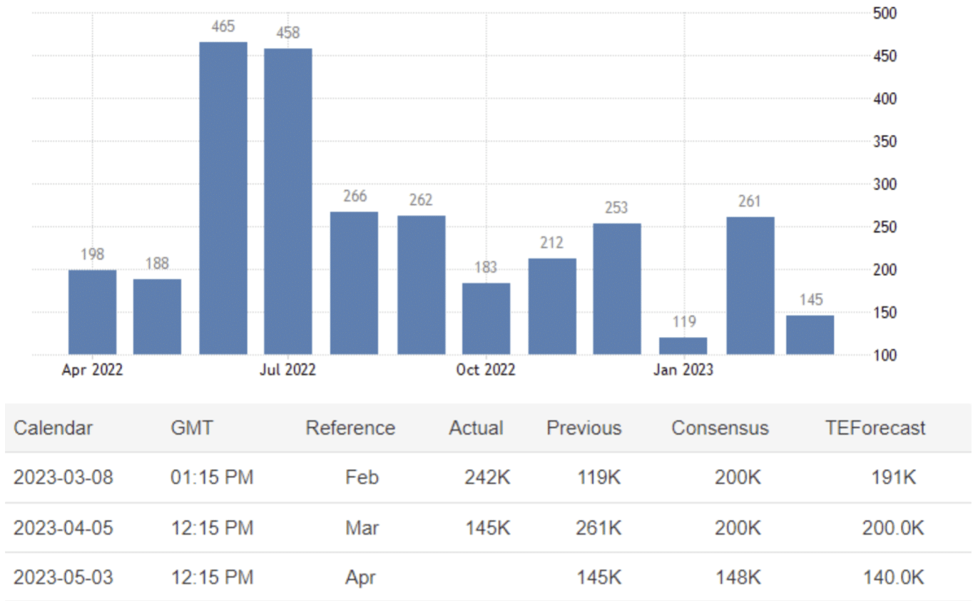 May 03 21:15 JPT; 12:15 GMT, 2023年3月の米国の民間企業の雇用創出数は14万5000人で、2月の26万1000人の上方修正と20万人の予測を下回り、消費者需要の減退と借入コストの上昇により労働市場が減速していることを示しています。