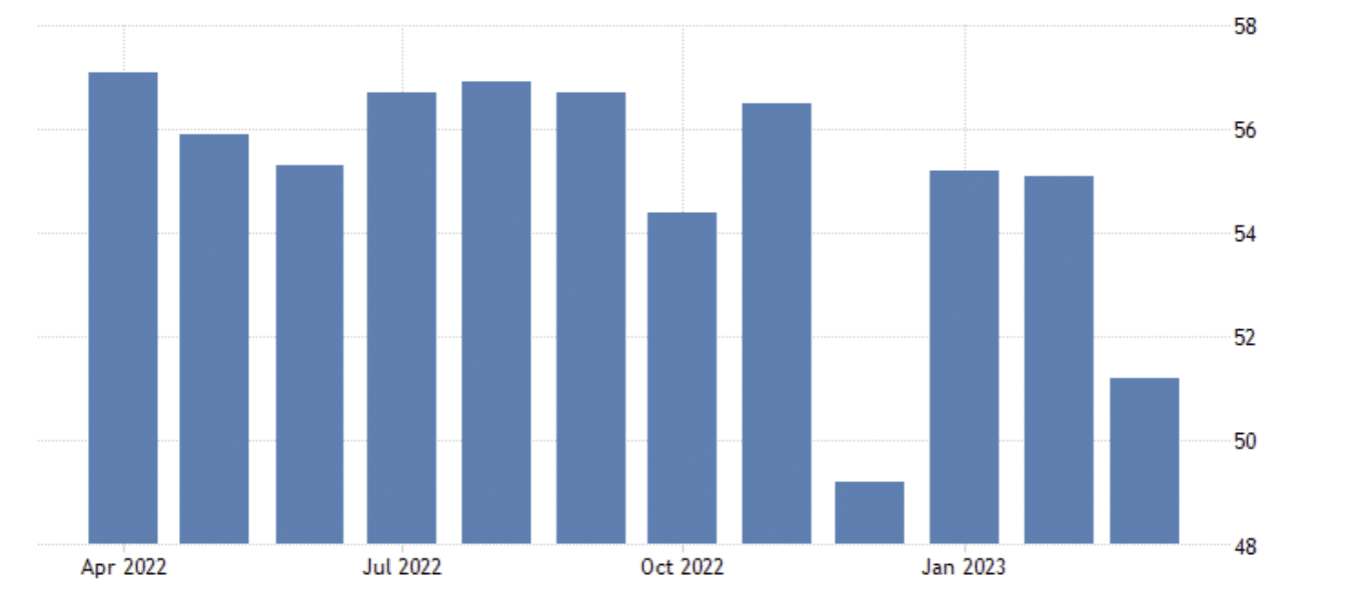 May 03 23:00 JPT; 14:00 GMT, 2023年3月のISMサービス業PMIは、2月の55.1から51.2に低下し、予想の54. 5を大きく下回りました。この数値は、需要と雇用の冷え込みにより、サービス部門の成長が3ヵ月で最も鈍化したことを指摘するものである。
