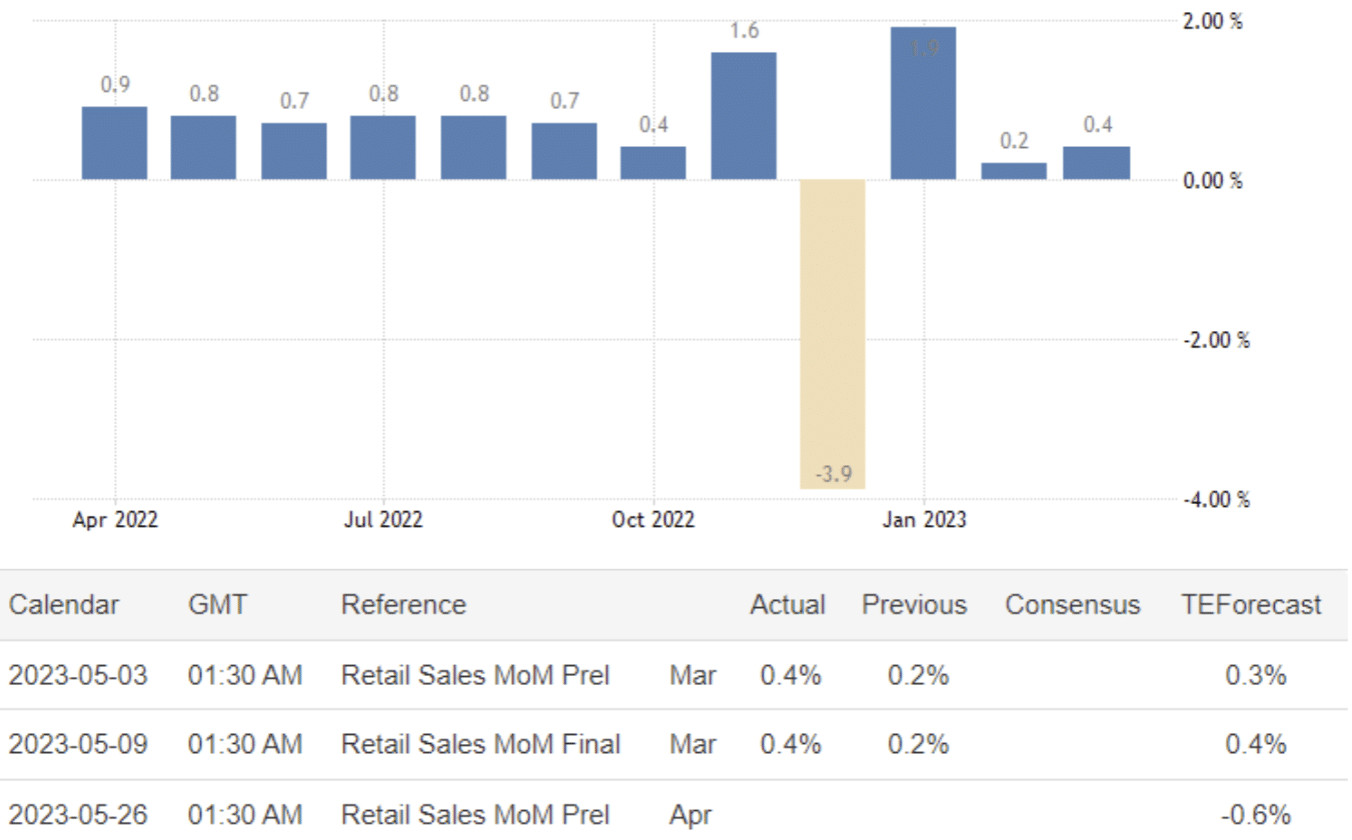 May 09 10:30 JPT; 01:30 GMT, 2023年3月のオーストラリアの小売売上高は、速報値から修正されず、2月の0.2%増に対し、0.4%増の353億豪ドルとなりました。食品小売業が13ヵ月連続の増加(2月の0.3%増に対して1.0%)となり、小売業は3ヵ月連続の増加となった。年間ベースでは、小売売上高は5.4%増となり、2021年9月以来の低水準となった。第1四半期は、小売売上高が0.6%減少し、第4四半期の0.3%減少に続き、2009年第3四半期以来の減少となりました。