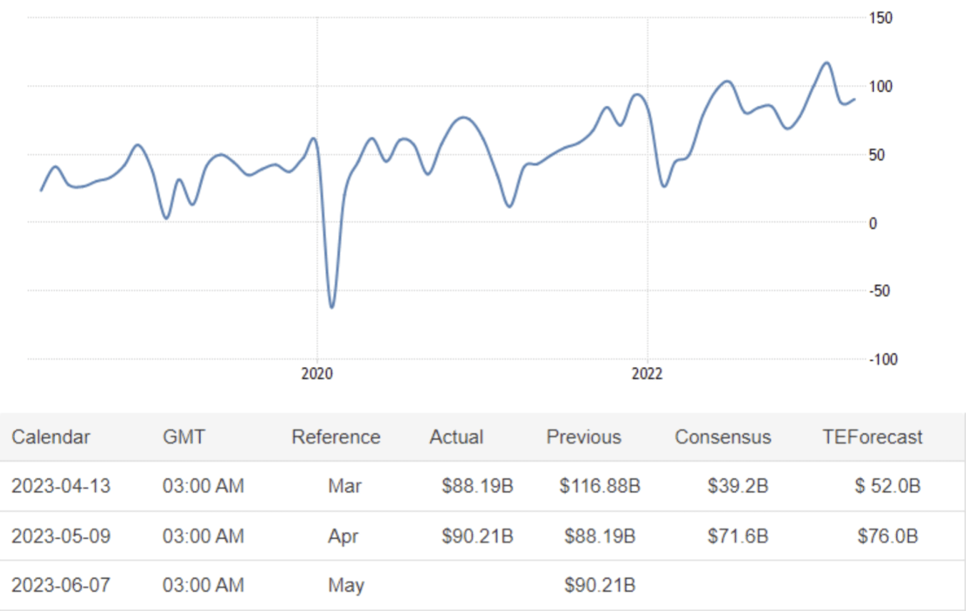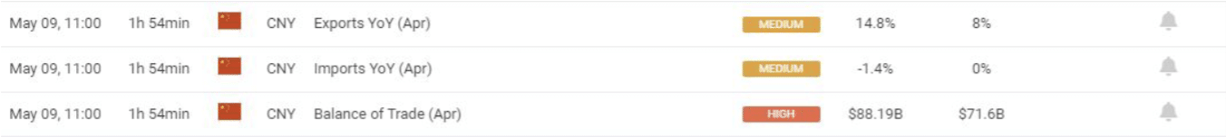 May 09 12:00 JPT; 03:00 GMT, 中国の2023年4月の貿易黒字は、前年同期の494億7000万米ドルから902億1000万米ドルに急増し、市場予想の716億米ドルをあっさり上回りました。