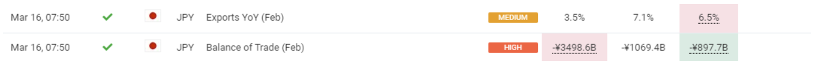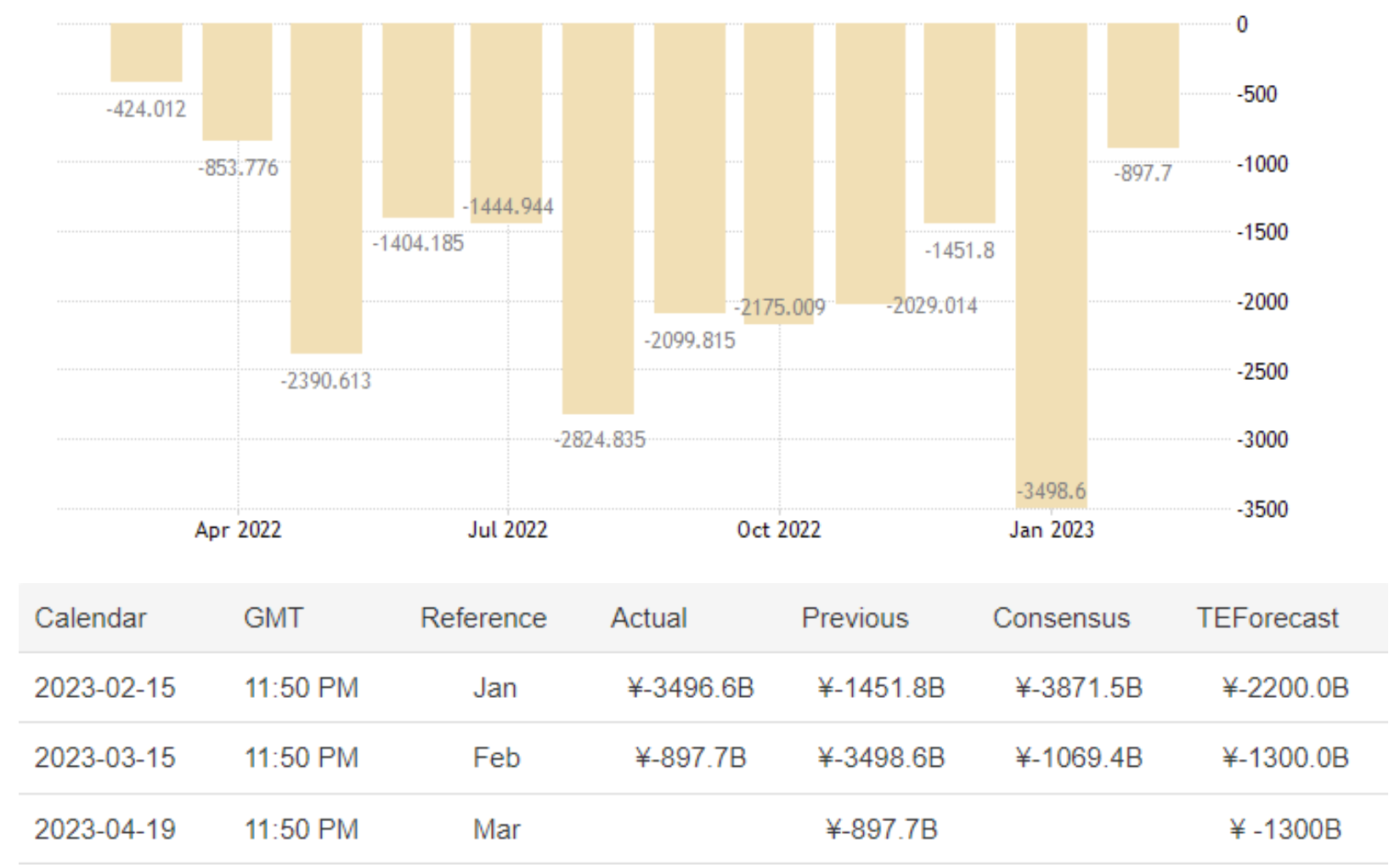 Mar 16 08:50 JPT; 23:50 GMT, 日本の 2023 年 2 月の貿易赤字は、前年同月の 7115 億円から 8977 億円に拡大し、市場コンセンサスの 1 兆 690 億円の差となりました。