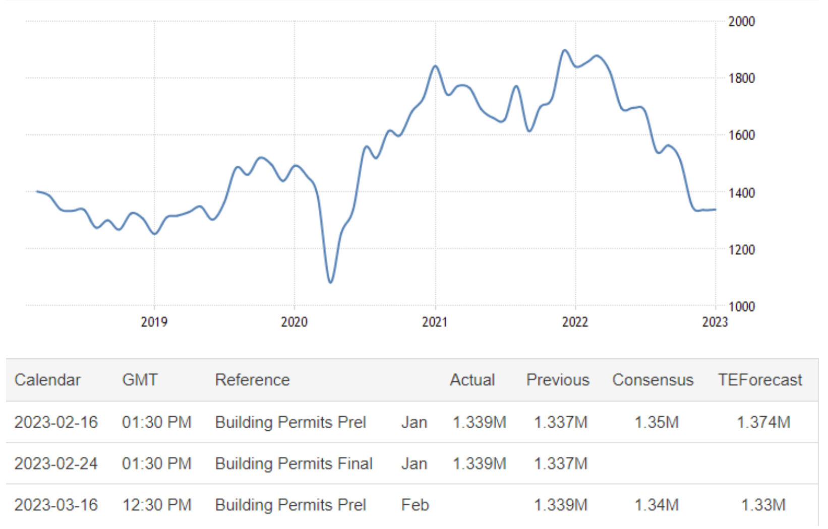 Mar 16 21:30 JPT; 12:30 GMT, 米国の 2023 年 1 月の建築許可件数は、高インフレと借入コストの上昇が引き続き新築住宅の需要を圧迫していることから、0.1%増の季節調整済み年率 133 万 9000 件と、12 月の 31 ヵ月ぶりの低水準に近い水準にとどまったことが、改定デー タから明らかになりました。