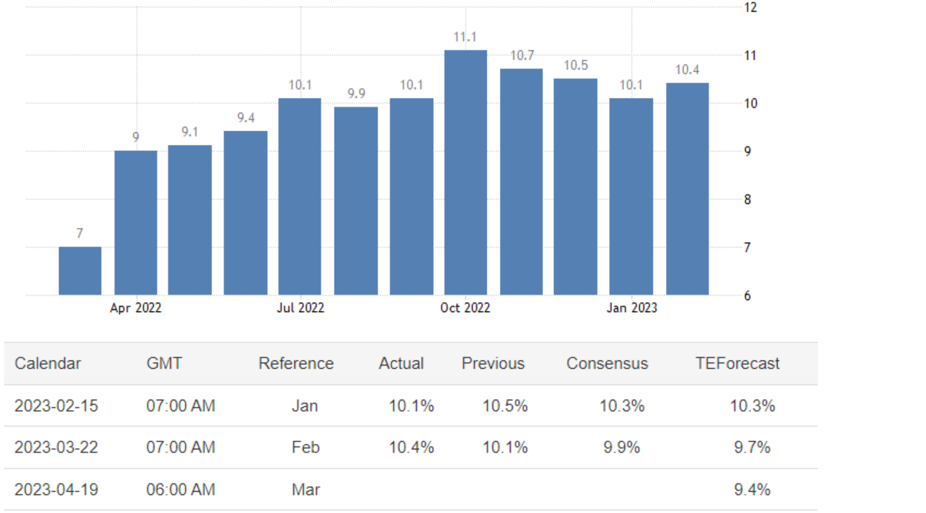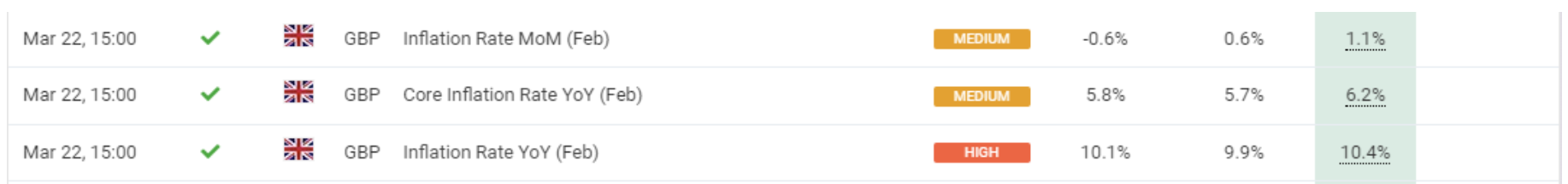 March 22 16:00 JPT; 07:00 GMT, 英国の 2023 年 2 月の年間インフレ率は予想に反して 1 月の10.1%から10.4%に上昇し、4 ヵ月ぶりの上昇となり、予想の9.9%を前向きに裏切る結果となりました。