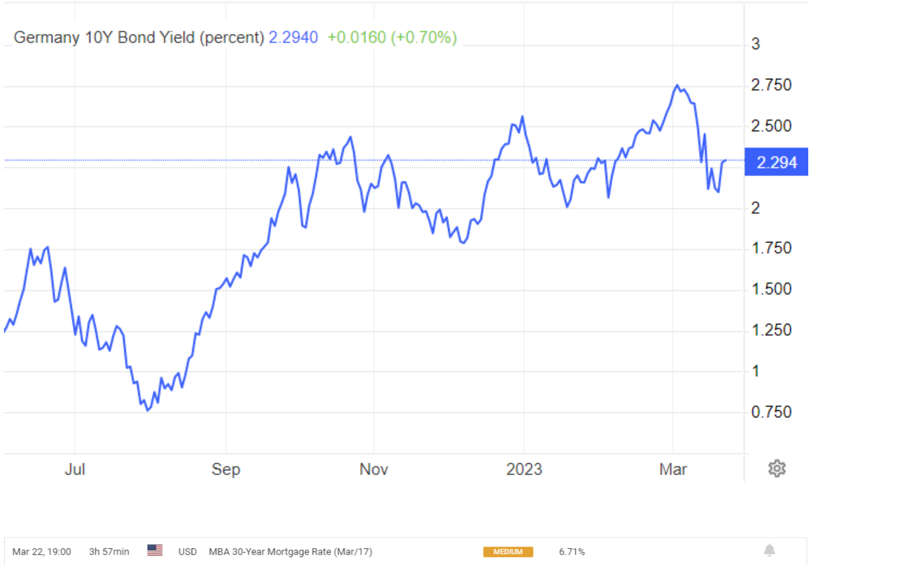 March 22 19:30 JPT; 10:30 GMT, 3 月 22 日(水)のドイツ 10 年債利回りは、この国債の満期の店頭インターバンク利回り相場によると 2.29%でした。