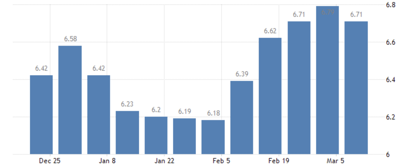 SVB の破綻が債券の上昇を促した後、5 週間ぶりの低下となりました。それでも住宅ローン金利は 11 月の高値に近い水準を維持していることが読み取れます。