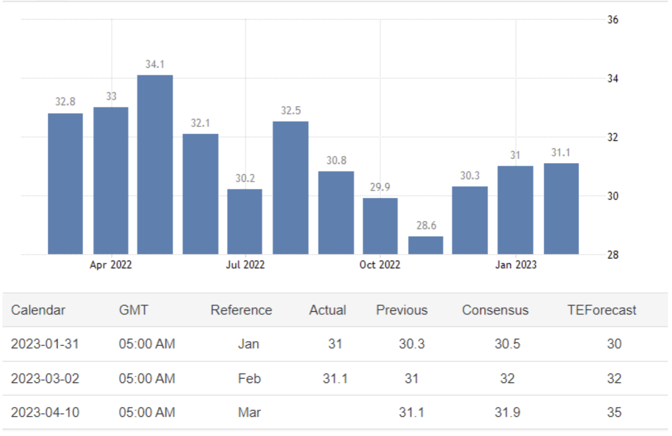 April 07 14:00 JPT; 05:00 GMT, 2023年2月の日本の消費者信頼感指数は、前月の31.0から31.1へと上昇し、市場予測の32.0と比較しました。これは、パンデミックによる混乱から景気がさらに回復し、家計のセンチメントが所得の増加(1月より0.6ポイント上昇し36.2)と雇用(0.8ポイント上昇し38.0)の両方に対して強まったことから、2022年8月以来の高い数値となりました。
