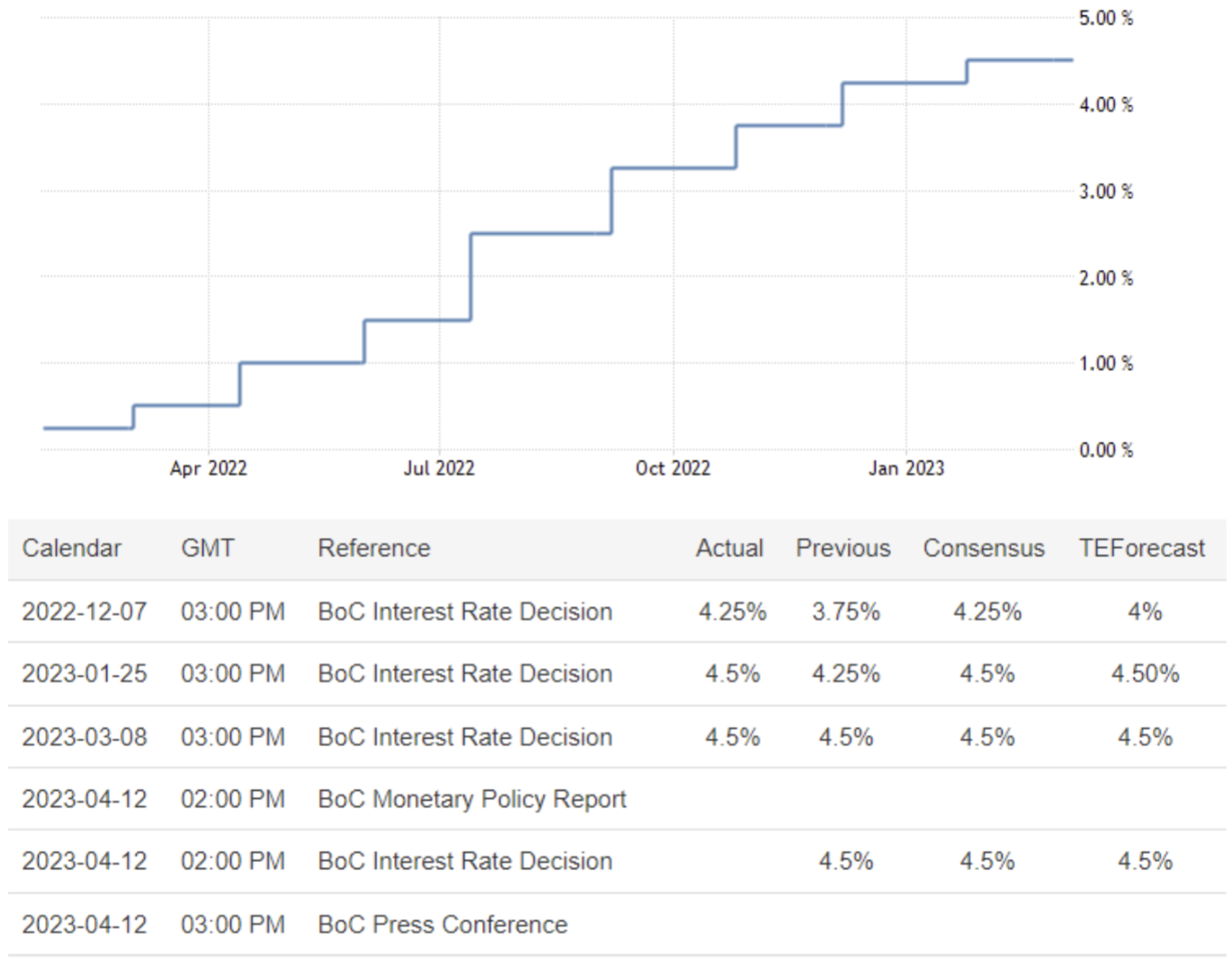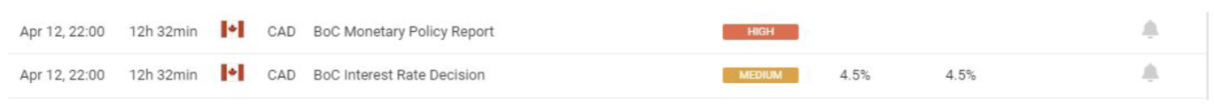 April 12 17:00 JPT; 08:00 GMT, カナダ中銀は、2023 年3 月の会合でオーバーナイト金利の目標を、これまでのシグナル通り4.5%に据え置き、経済状況が最新の金融政策報告書の予想にほぼ沿って進展すれば、現在の金利水準を維持し続けるべきであると表明した。この決定は、1 月の25bps の利上げに続くもので、BoC が優先順位を変えて成長を支援することを選択したため、主要金融当局の引き締めキャンペーンが初めて停止したことを意味します。