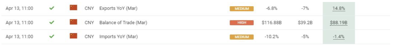April 13 12:00 JPT; 03:00 GMT, 中国の貿易黒字は、前年同期の443.5億米ドルから2023年3月には881.9億米ドルに拡大し、市場予想の392億米ドルをあっさり上回りました。