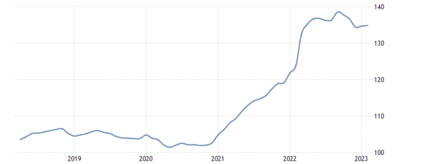 ドイツの卸売物価は、2023年1月の134.70ポイントから2月に134.90ポイントに上昇しています。