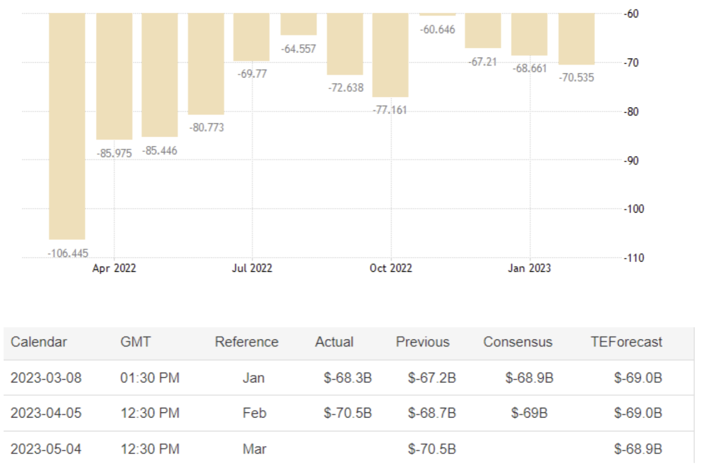 April 14 21:30 JPT; 12:30 GMT, 2023年2月の米国の貿易赤字は705億ドルに増加し、4カ月ぶりの高水準で、予測の690億ドルをわずかに上回った。財の赤字が27億ドル増の930億ドル、サービスの黒字が8億ドル増の224億ドルとなったことを反映している。