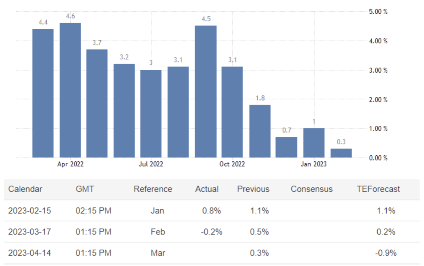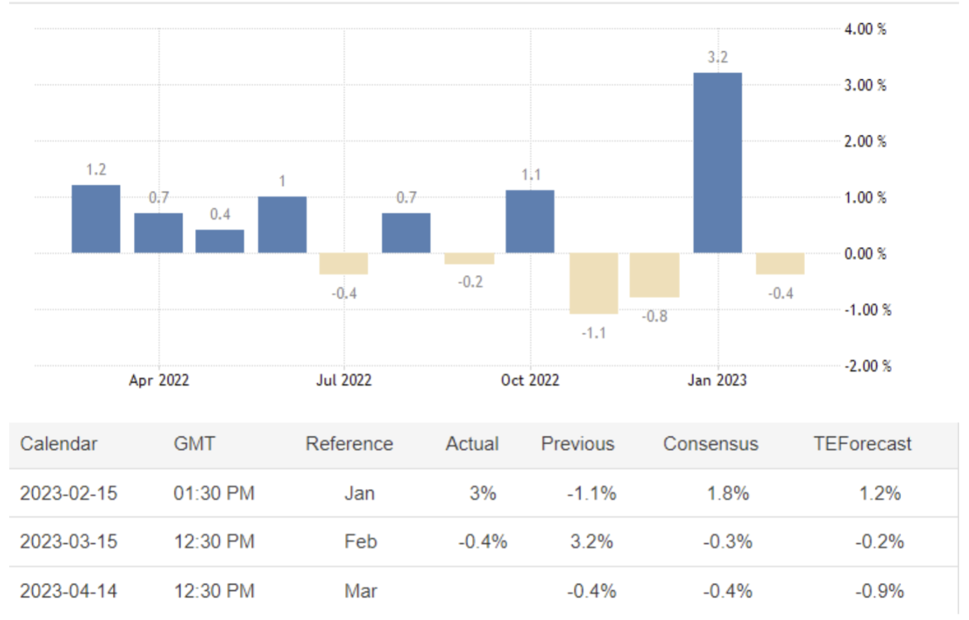 April 14 21:30 JPT; 12:30 GMT, 2023年2月の米国小売売上高は前月比0.4%減となり、市場予想の0.3%減に対し、2021年3月以来の大幅増となった1月の3.2%増の上方修正に続いての減少となりました。