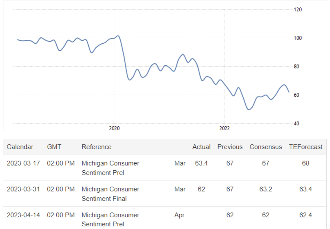 April 14 15:00 JPT; 06:00 GMT, 2023年3月の米国ミシガン大学消費者心理は、速報値の67から62に下方修正されました。消費者が今後景気後退を予想する傾向が強まり、4ヶ月ぶりにセンチメントが低下した。
