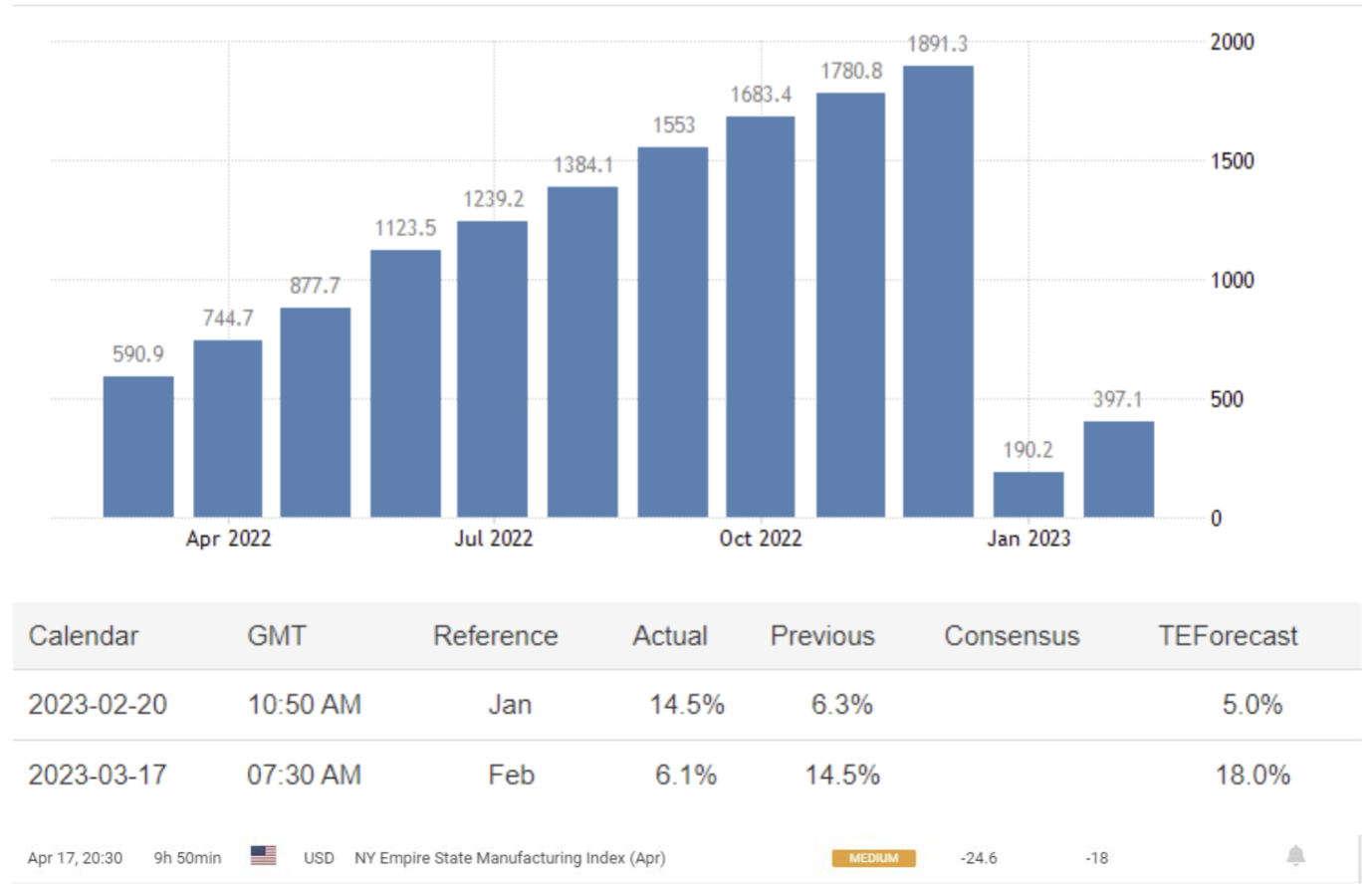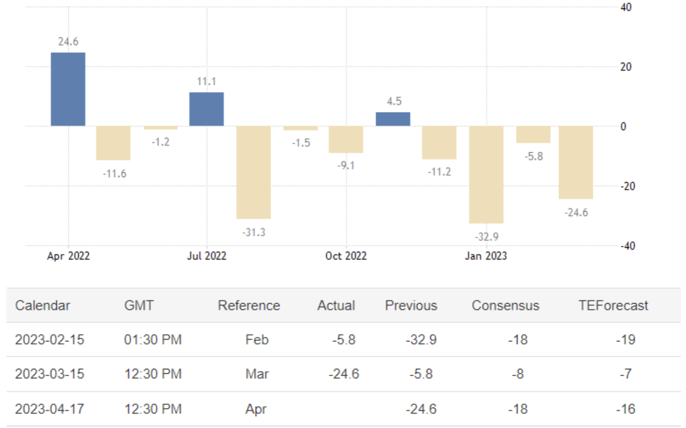April 17 21:30 JPT; 12:30 GMT, 2023 年3 月のNY エンパイアステート製造業景気指数は、2月の-5.8 から-24.6 に沈み、市場予想の-8 を大きく下回りました。