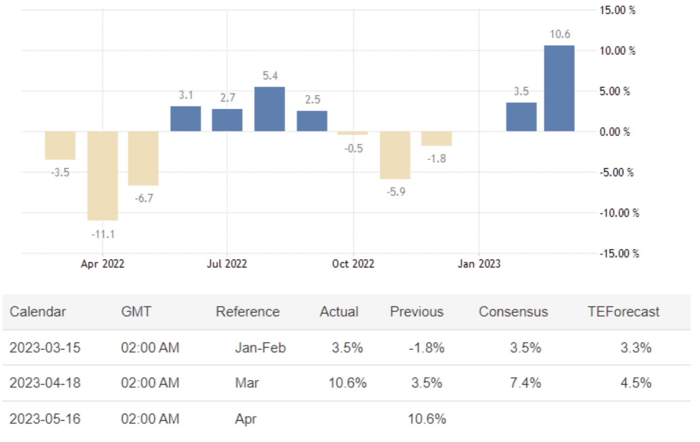 April 18 11:00 JPT; 02:00 GMT, 2023年3月の中国の小売業売上高は前年比10.6%増となり、前月の3.5%増から急加速し、市場予想の7.4%を軽々と上回りました。