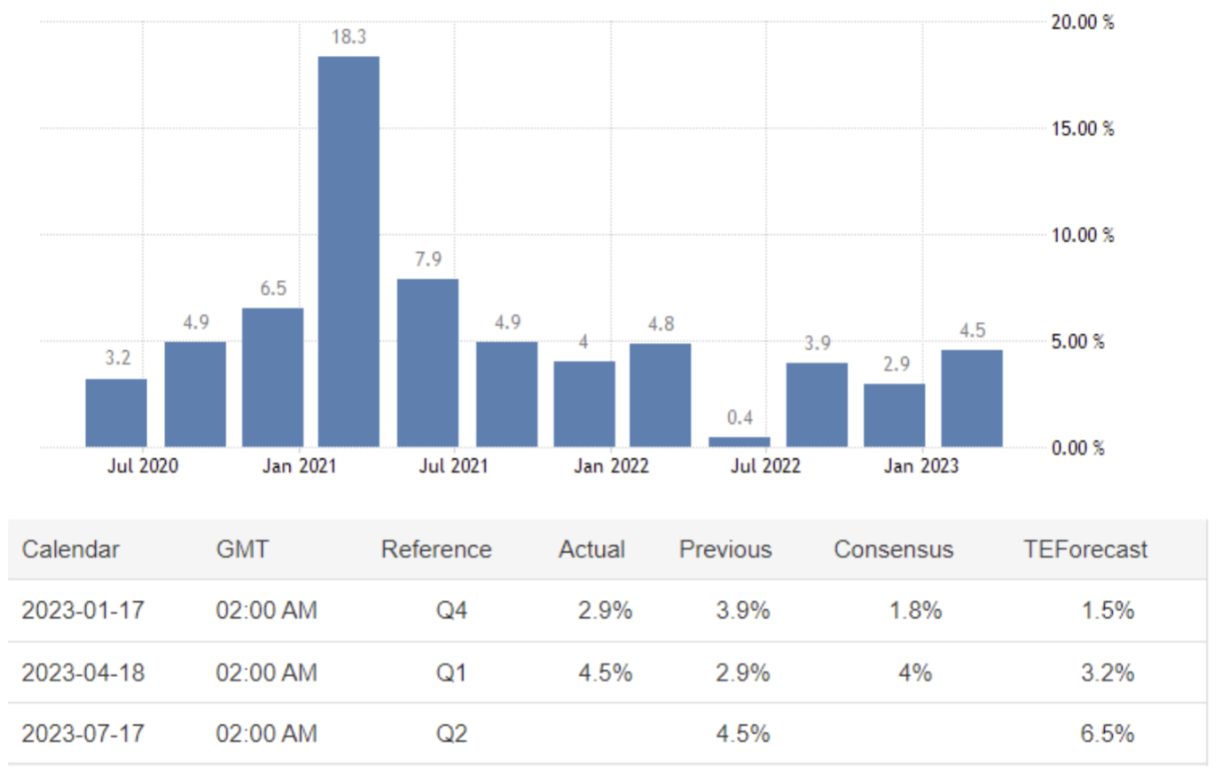 April 18 11:00 JPT; 2:00 GMT, 2023年第1四半期の中国経済は前年同期比4.5%増となり、第4四半期の2.9%増から加速し、市場予想の4%を上回った。これは、パンデミック後の回復に拍車をかける北京の努力を背景に、2022年第1四半期以降で最も強い拡大ペースとなった。