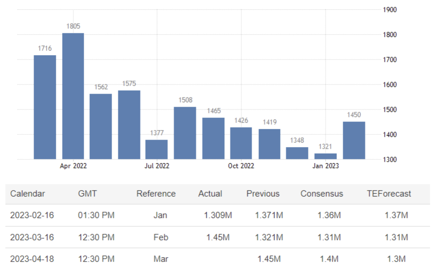一戸建て住宅着工戸数は1.1%増の830千戸、5戸以上の建物の着工戸数は24.1%増の608千戸となり、昨年4月以来の高水準となった。しかし、2022年2月と比較すると、住宅着工件数は18.4%減少している。1月の住宅着工件数は、当初予想の130.9万件から132.1万件に上方修正されたが、2020年6月以来の低水準にとどまった。