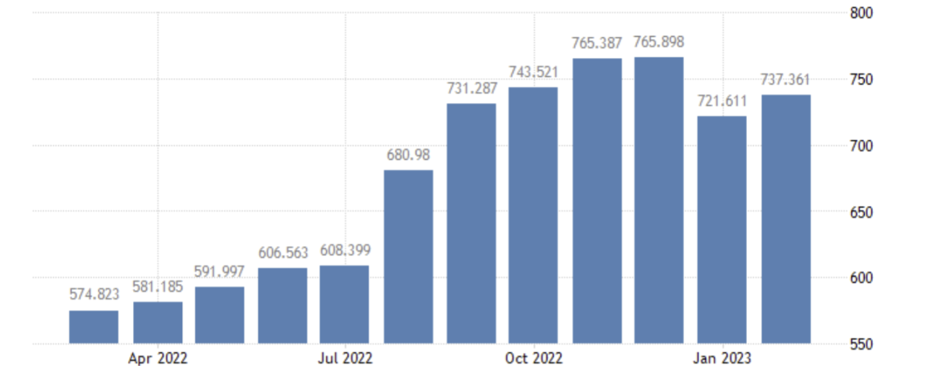 April 19 15:00 JPT; 06:00 GMT, ユーロ圏の自動車登録台数は、2023年1月の721.61千台から2月には737.36千台に増加した。
