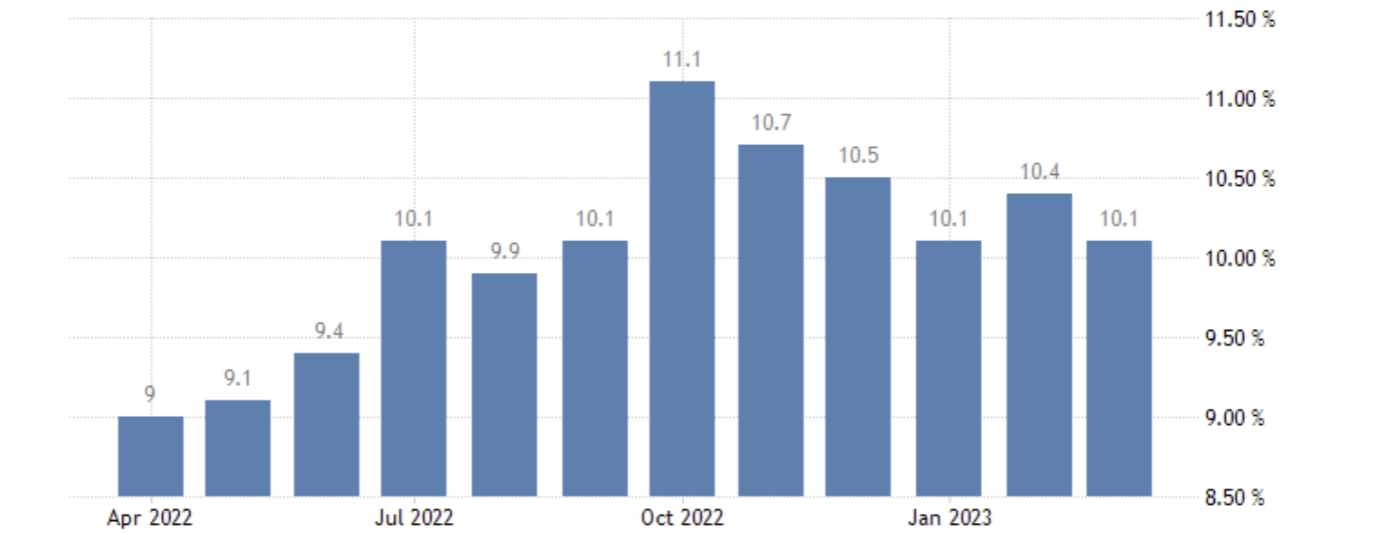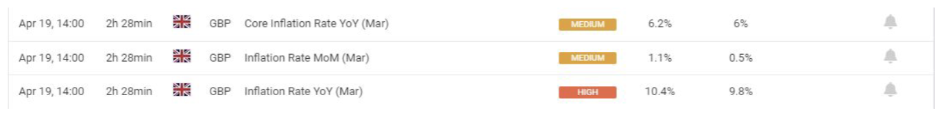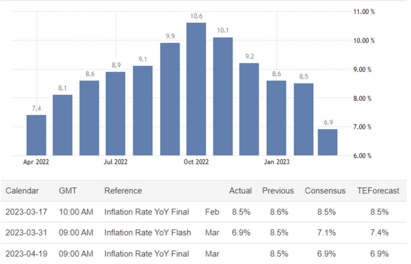 April 19 15:00 JPT; 06:00 GMT, 2023年3月の英国の消費者物価上昇率は前年同月比10.1%と、前月の10.4%から低下したものの、市場予想の9.8%をわずかに上回る水準に緩和された。