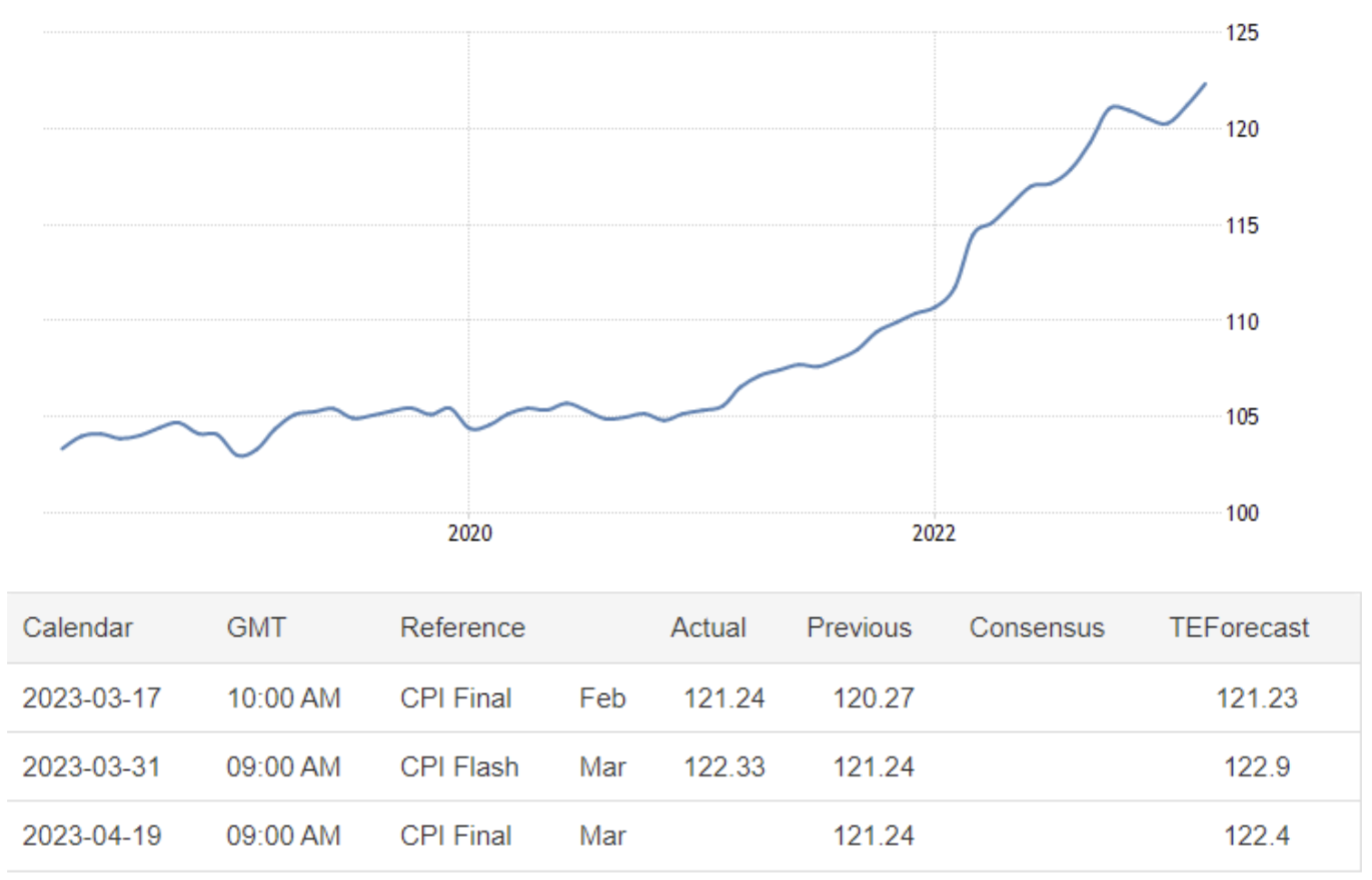 ユーロ圏の消費者物価指数CPIは、2023年2月の121.24ポイントから3月に122.33ポイントに上昇した。