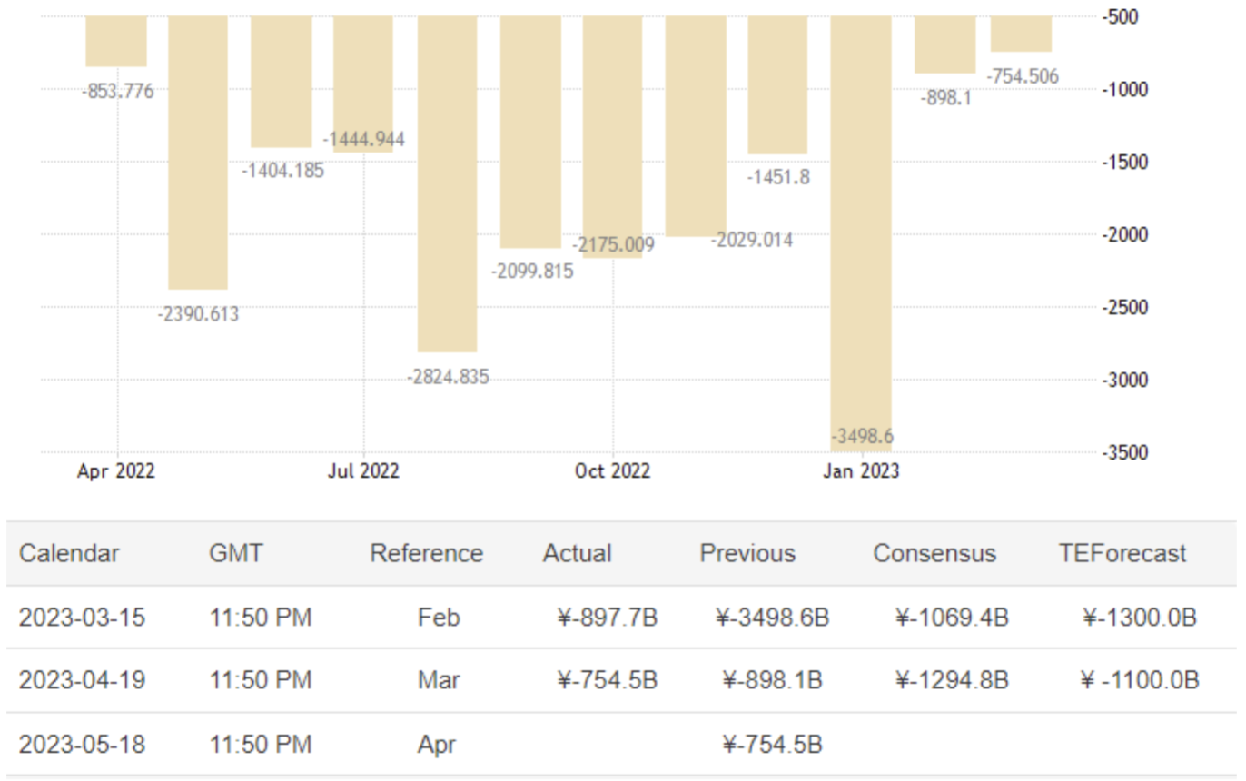 April 20 08:50 JPT; 23:50 GMT, 日本の2023年3月の貿易赤字は、市場コンセンサスの1兆2948億円のギャップに対し、前年同月の4649億円から7547億円に拡大しました。
