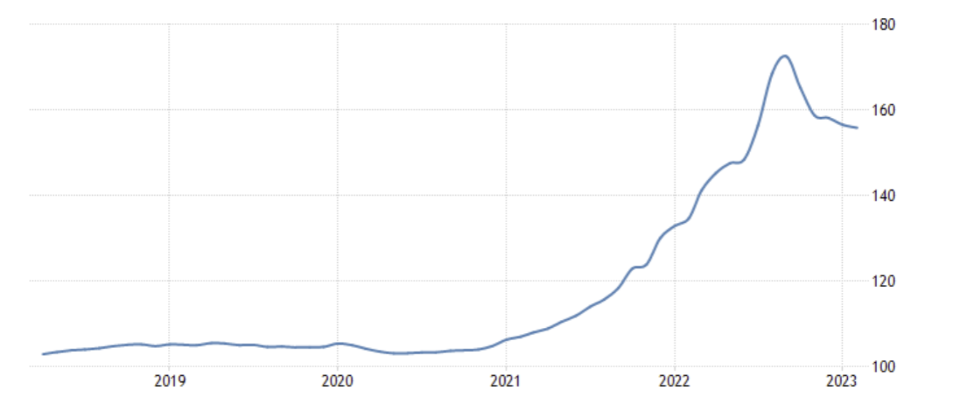 ドイツの生産者物価は、2023年1月の156.50ポイントから2月は155.80ポイントに低下しました。