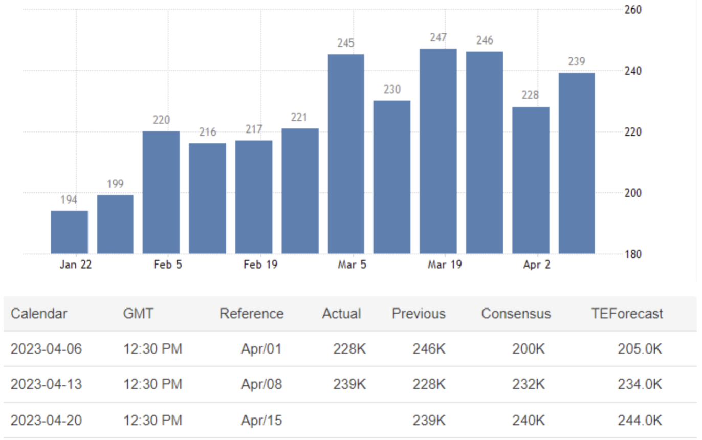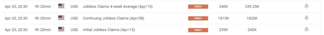 April 20 21:30 JPT; 12:30 GMT, 4月8日に終わる週の米国人失業者数は11千人増の239千人となり、市場予想(232千人)を上回った。失業保険申請件数は3週間ぶりに増加し、3月の一連のデータで米国の労働市場の軟化が指摘され、米連邦準備制度理事会が今年中に複数回の利下げを行う可能性があるという現在のベットが強化されたことと一致している。