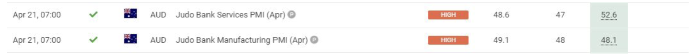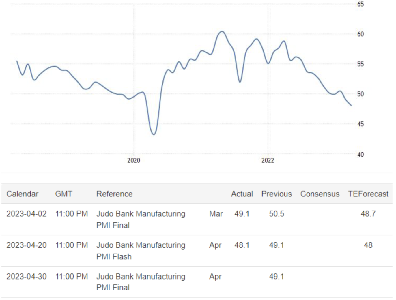 April 21 08:00 JPT; 23:00 GMT, 2023年4月の柔道銀行オーストラリア製造業PMIは、前月の49.1から48.1に低下した(速報値)。