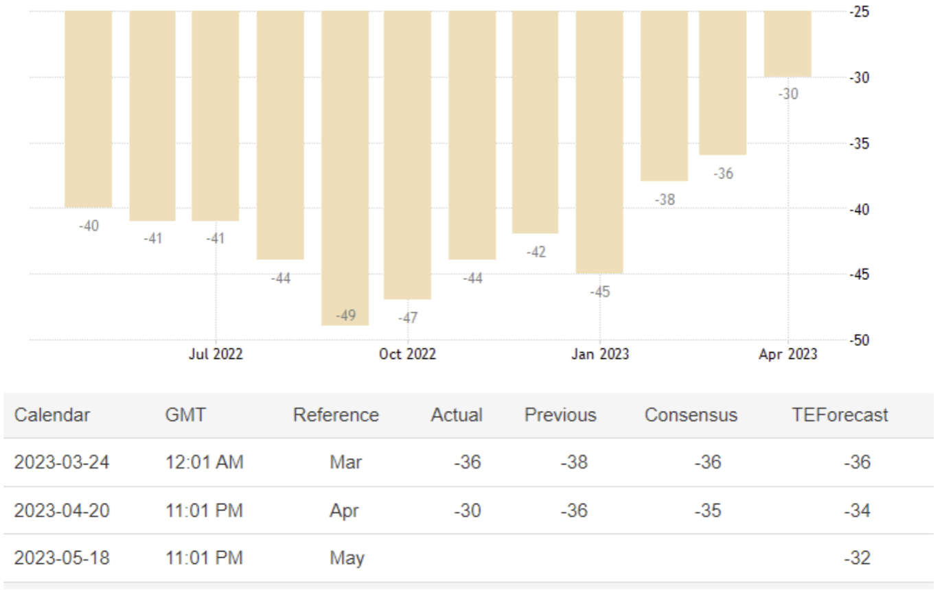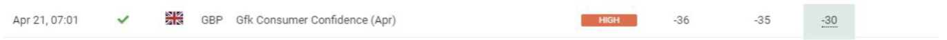 April 21 08:01 JPT; 23:01 GMT, 2023年4月の英国GfK消費者信頼感指数は、3月の-36から-30に上昇し、2022年2月以来の高水準を記録、市場予想の-35を上回りました。