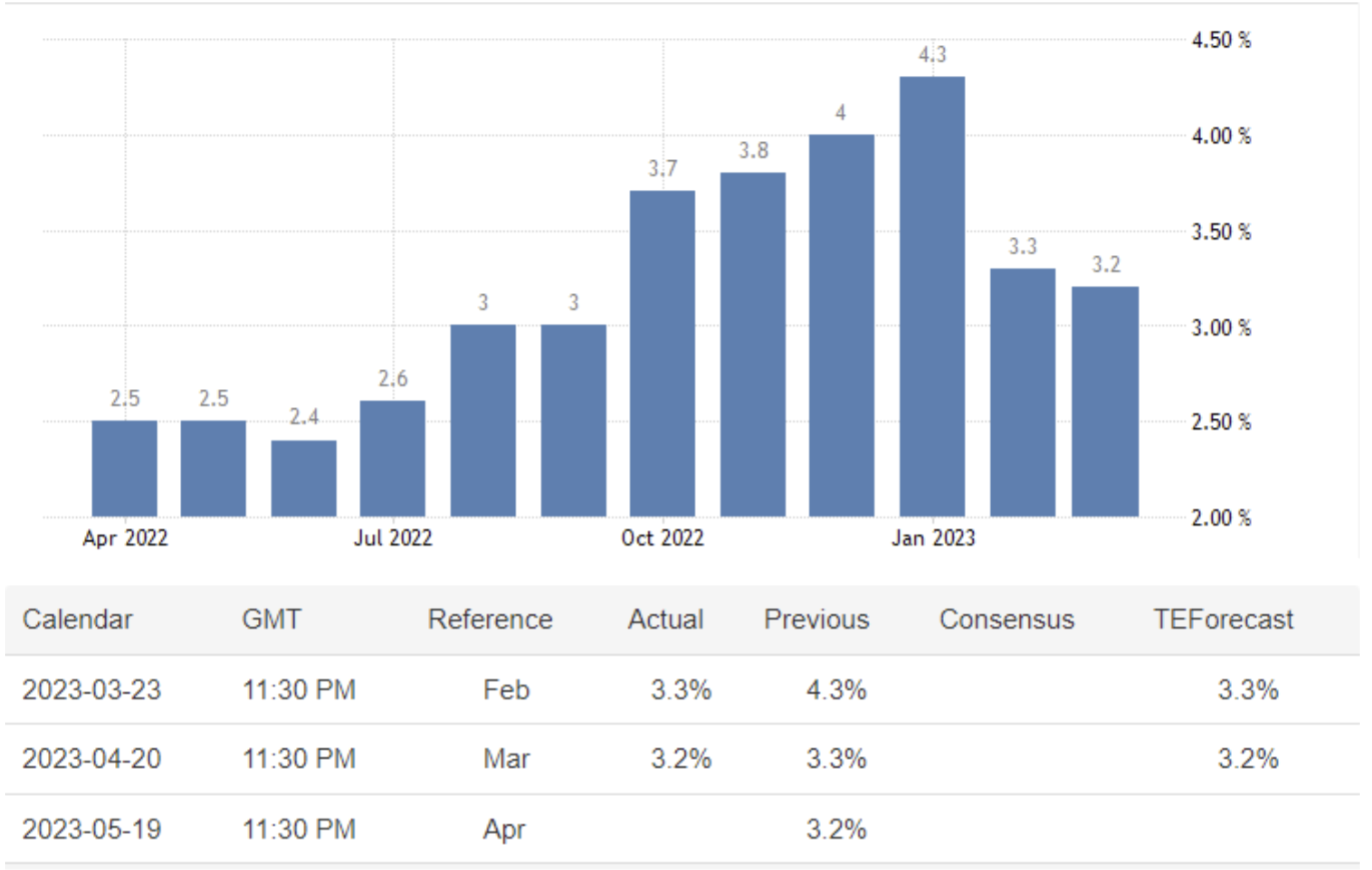 April 21 08:30 JPT; 23:30 GMT, 2023年3月の日本の年間インフレ率は、前月の3.3%から3.2%に低下しました。これは、輸送コストの上昇が6ヵ月ぶりに最小となった(2月の1.7%に対し1.6%)ためで、昨年9月以来の低水準をマークしています。