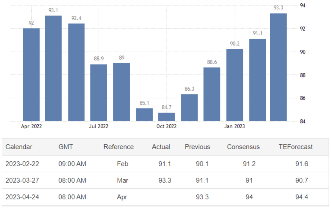 最近の銀行の混乱、物価や借入コストの高騰にもかかわらず、企業の信頼感は5 カ月連続で上昇。現状判断サブインデックスは93.9 から95.4 に上昇し、期待ゲージは下方修正され、88.4 から91.2 に上昇しました。
