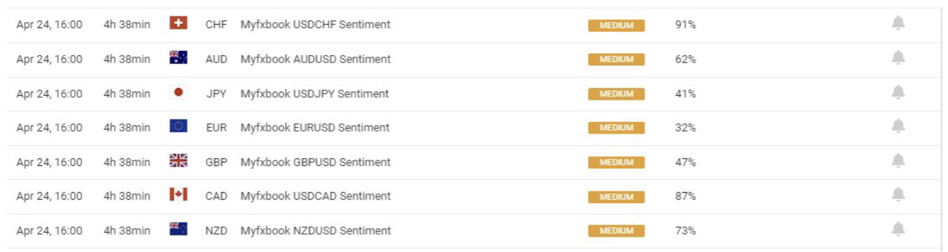 April 24 17:00 JPT; 08:00 GMT, Myfxbook Sentiment Indicator は、トレーダーにとって非常に重要なツールです。このインディケータは、親族の通貨ペアの買い手と売り手のパーセンテージを表示します。最新の市場パターンを見て、市場が方向転換しそうな場所を特定することで、トレーダーがより良い意思決定をするのに役立ちます。Myfxbook に接続されたライブ口座に基づきます。