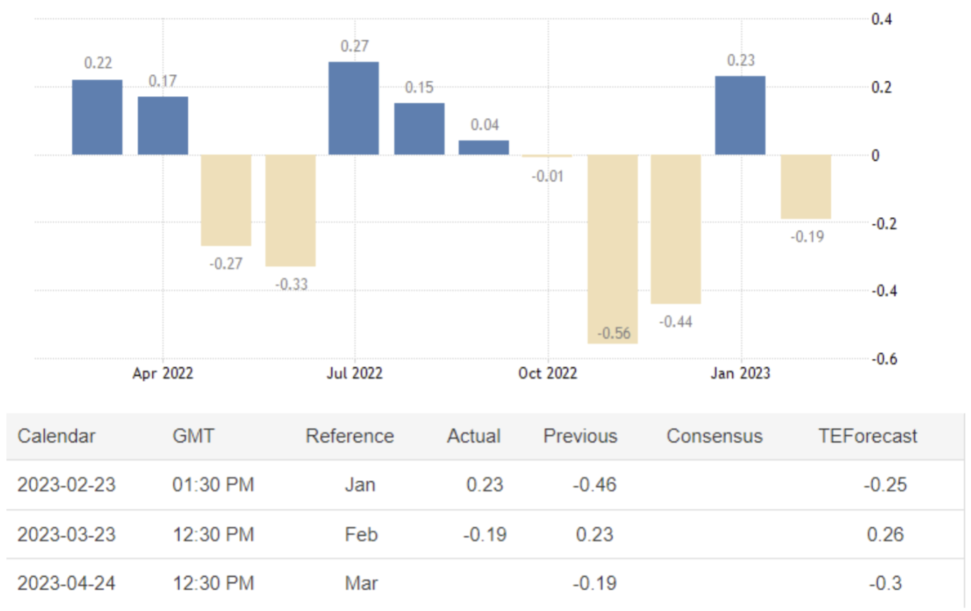 April 24 21:30 JPT; 12:30 GMT, 2023 年2 月のシカゴ連銀全米活動指数は、1 月の+0.23 から-0.19 に低下しました。指数の構成に用いる4 つの大分類の指標すべてがマイナス寄与となり、3 つの分類が1 月から悪化した。