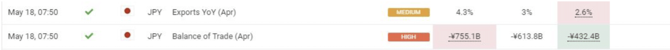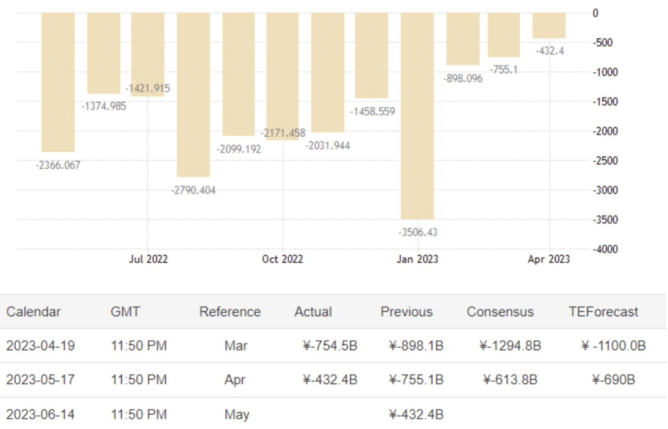 May 18 08:50 JPT; 23:50 GMT, 日本の2023年4月の貿易赤字は、前年同月の8549億円から4324億円に減少し、市場予想の6138億円の開きを下回りました。