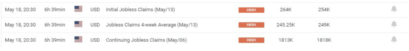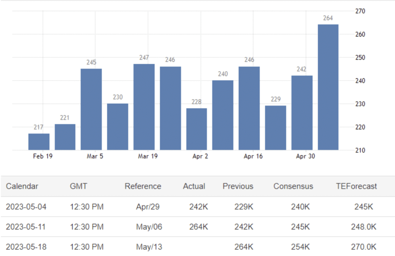 May 18 21:30 JPT; 12:30 GMT, 5月6日に終わる週の米国人の失業手当申請者数は22千人増の264千人となり、2021年10月以来の多さで、市場予想の245千人を大きく上回りました。