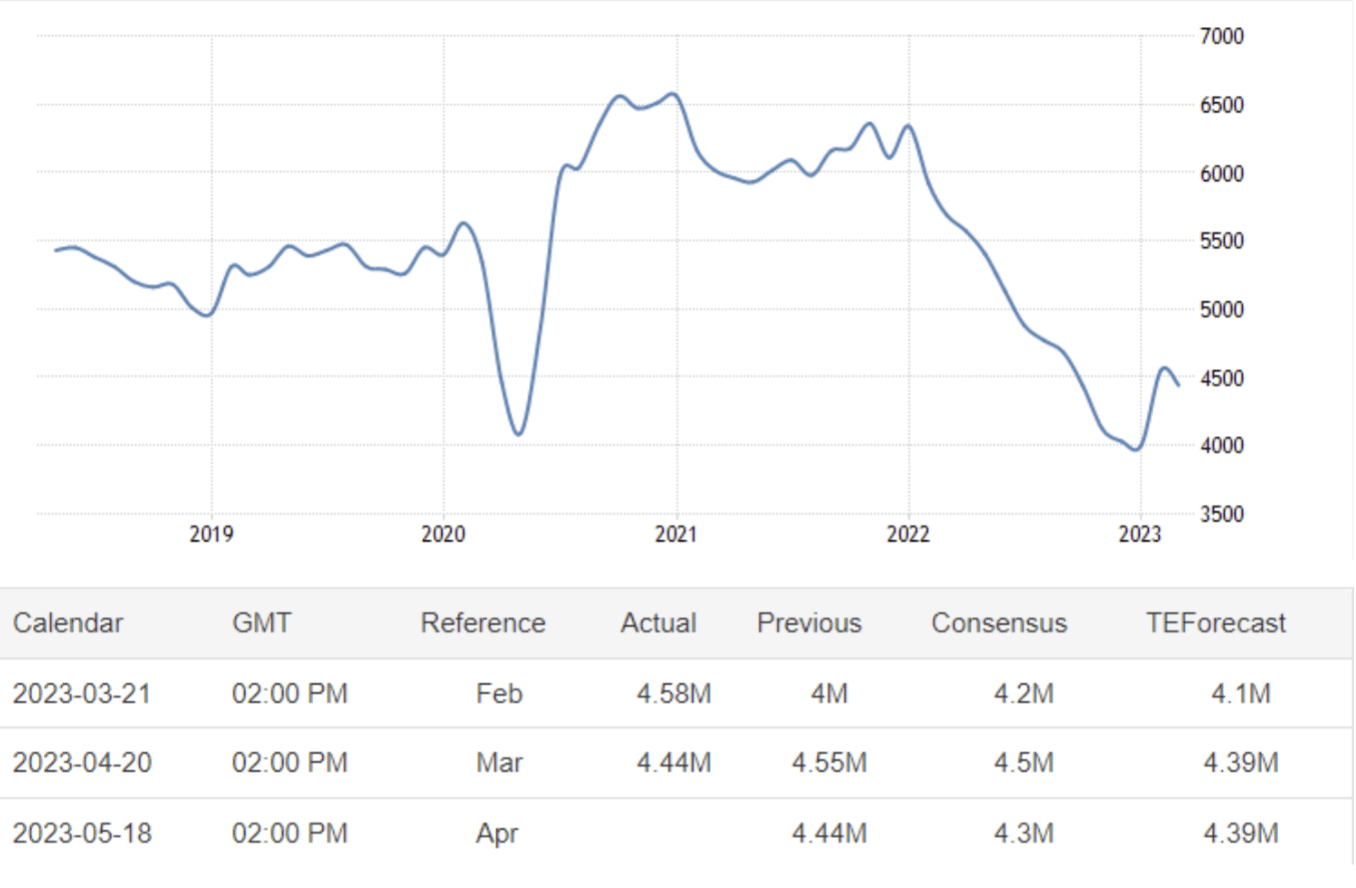 May 18 23:00 JPT; 14:00 GMT, 一戸建て、タウンホーム、コンドミニアム、コーポの取引完了を含む米国の2023年3月の中古住宅販売件数は、市場予測450万件に対し、季節調整済み年率444万件と2.4%ママ減少しました。