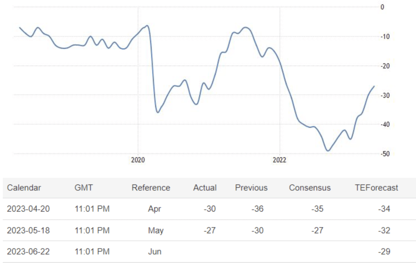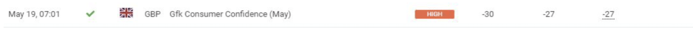 May 19 08:01 JPT; 23:01 GMT, 英国のGfK消費者信頼感指標は、2023年5月に4月の-30から-27に上昇し、4ヶ月連続で改善しました。これは、インフレが続いているにもかかわらず、英国の家計が経済と自分の経済について楽観的になっているためです。