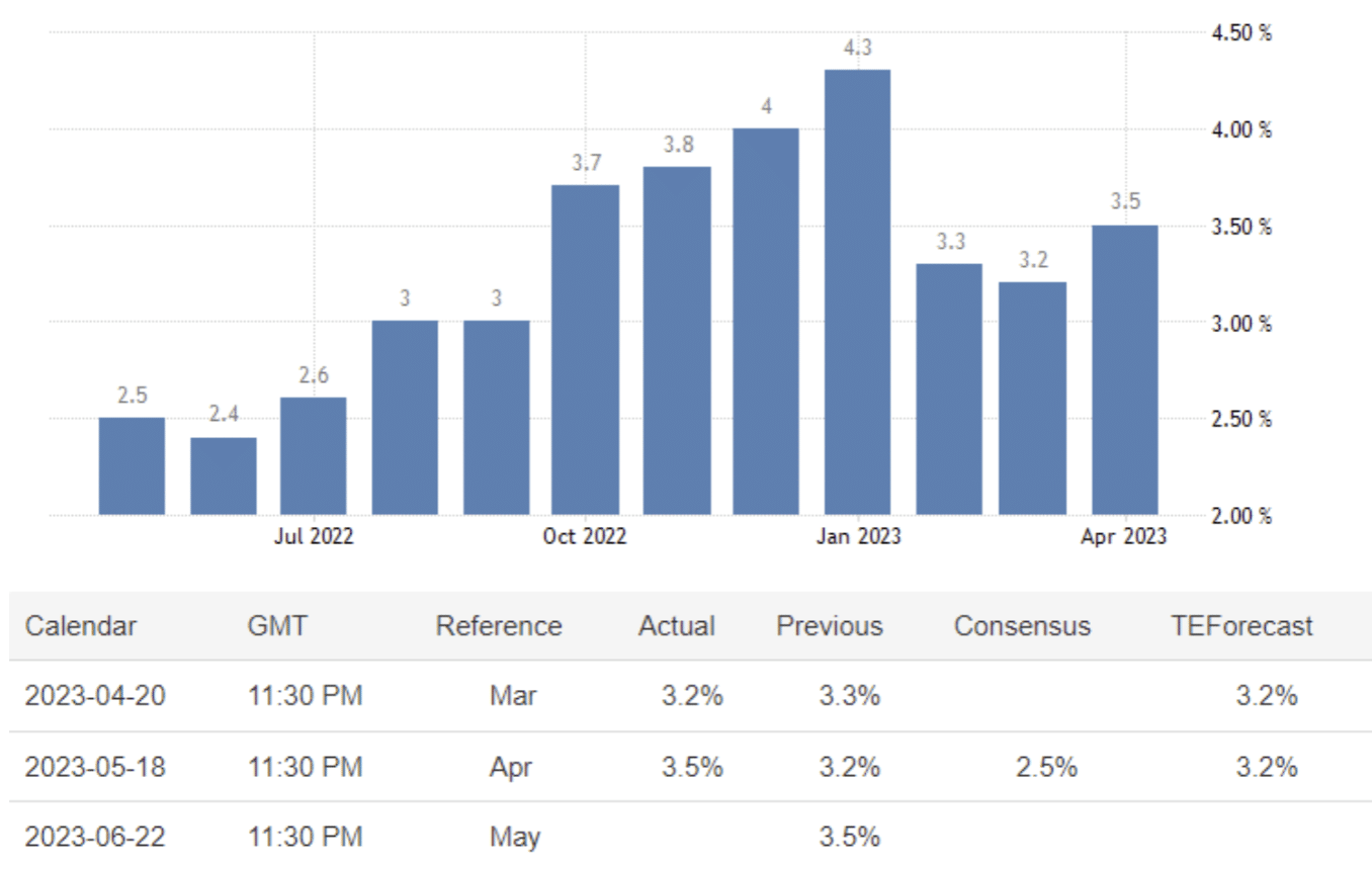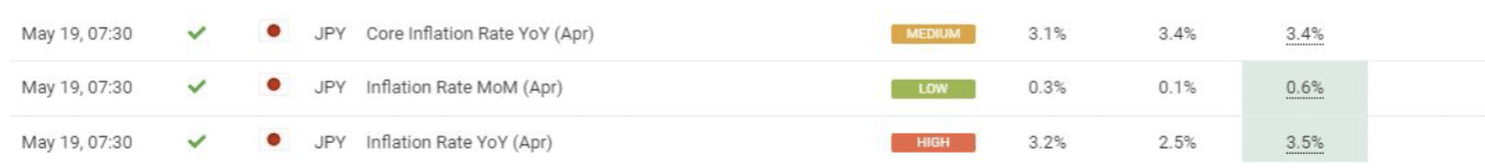 May 19 08:30 JPT; 23:30 GMT, 日本の年間インフレ率は、食料品価格が1976年8月以来最も上昇し(8.4% vs 3月の7.8%)、3月の6ヵ月ぶりの低水準となる3.2%から、2023年4月には3.5%に上昇しました。